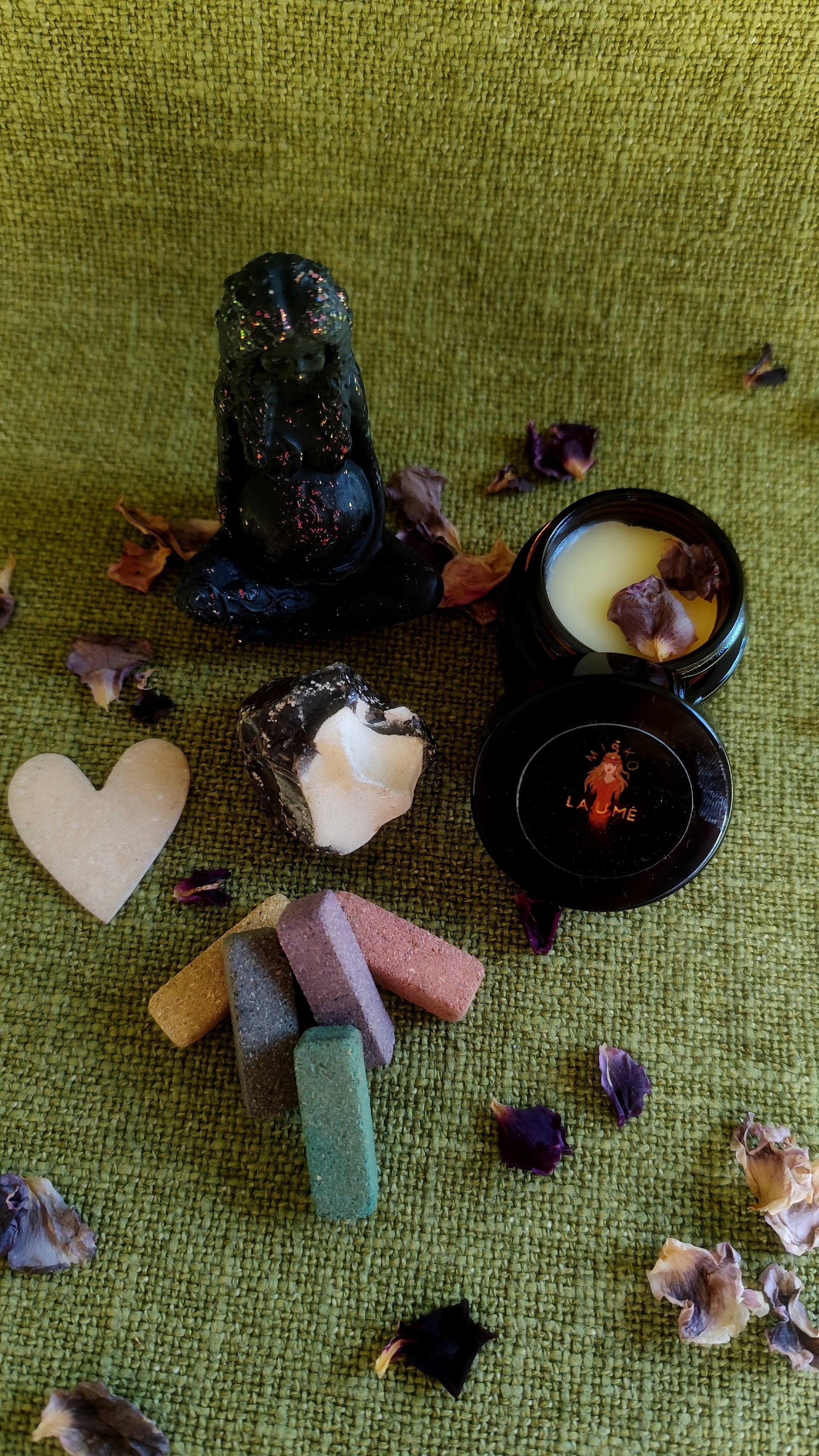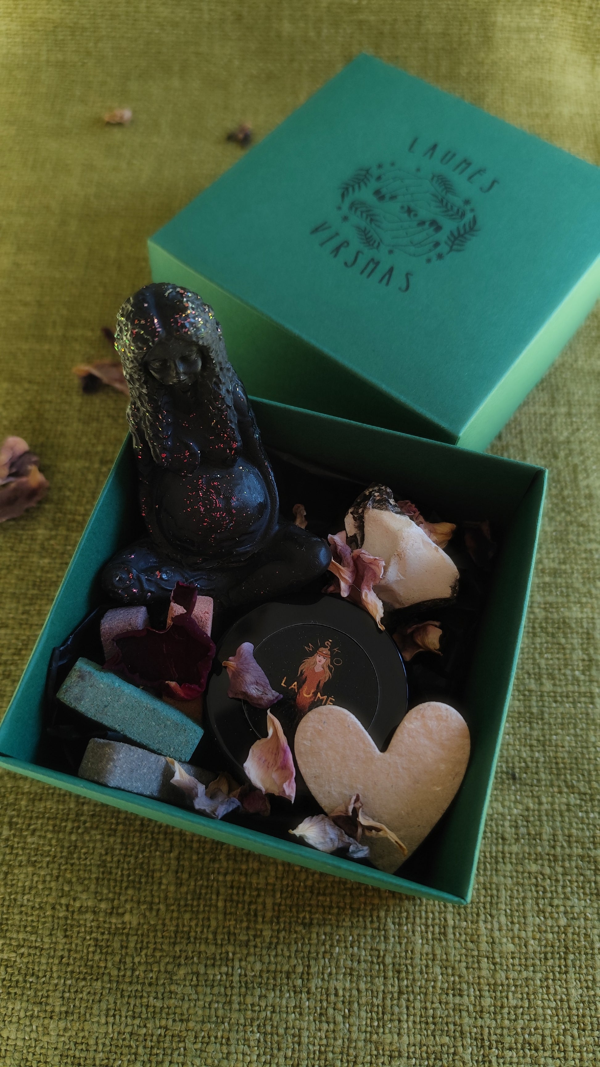Rinkinyje yra kvapni, bičių vaško Motinos Žemės skulptūrėlė, titnagas - akmuo apsaugai ir vidinės ugnies palaikymui, kvapnus rankų (ir kūno) tepalas, pagamintas iš bičių vaško ir eterinių aliejų, jis taip pat gali būti naudojamas kaip kvepalai, penkių rūšių mini smilkalai.