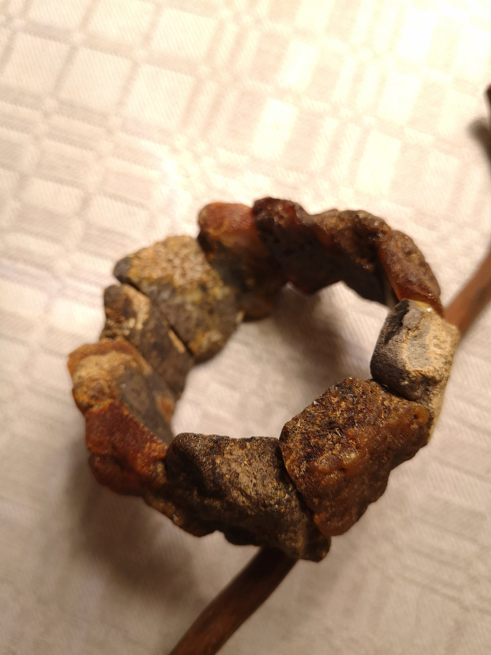 Šios apyrankės gintarai yra visiškai neapdirbti. Suverti ant tamprios dvigubos gumelės. Neištempus apimtis yra 18 cm iš vidinės pusės. Gintarų dydis 3,5-4 cm