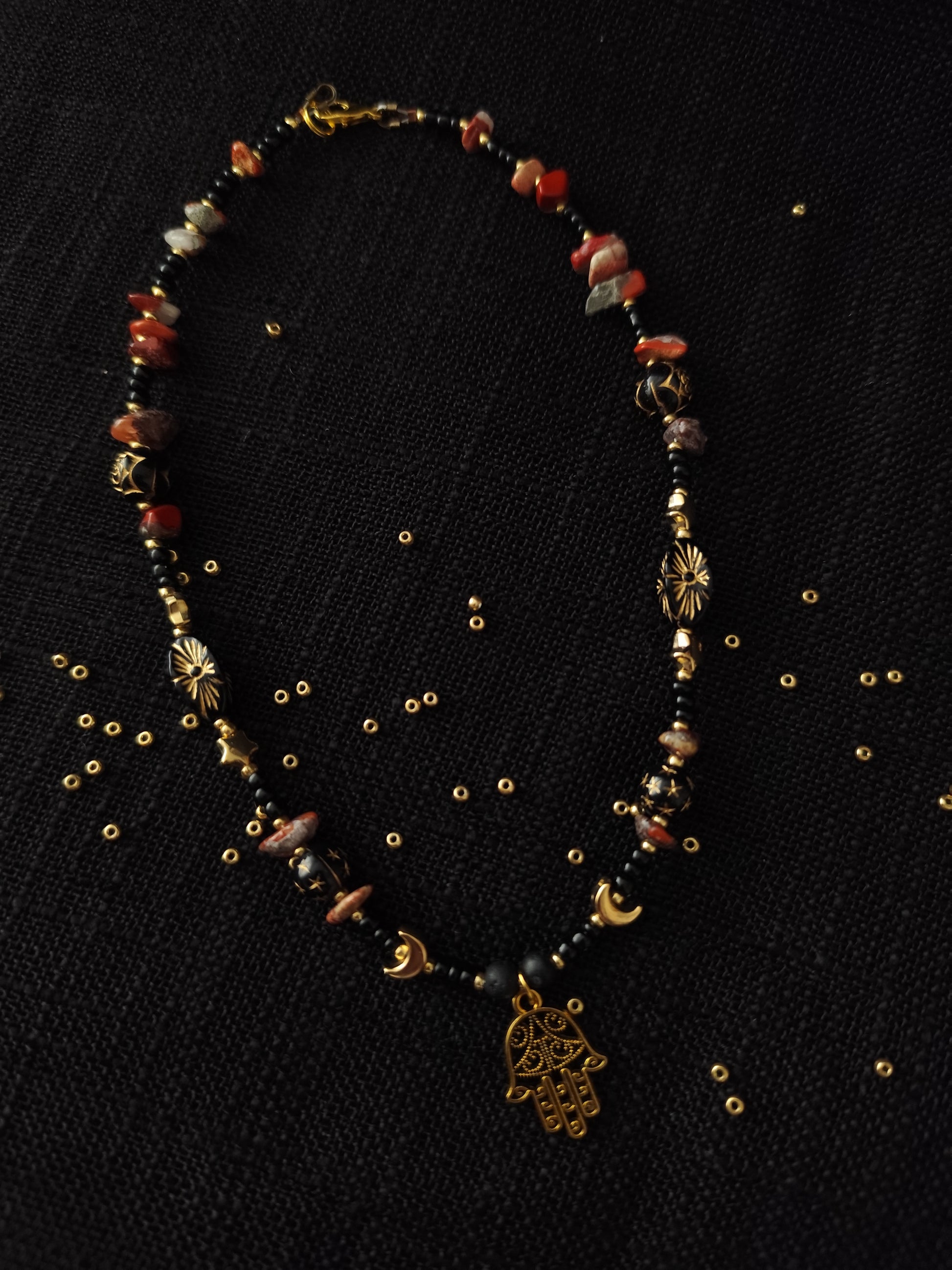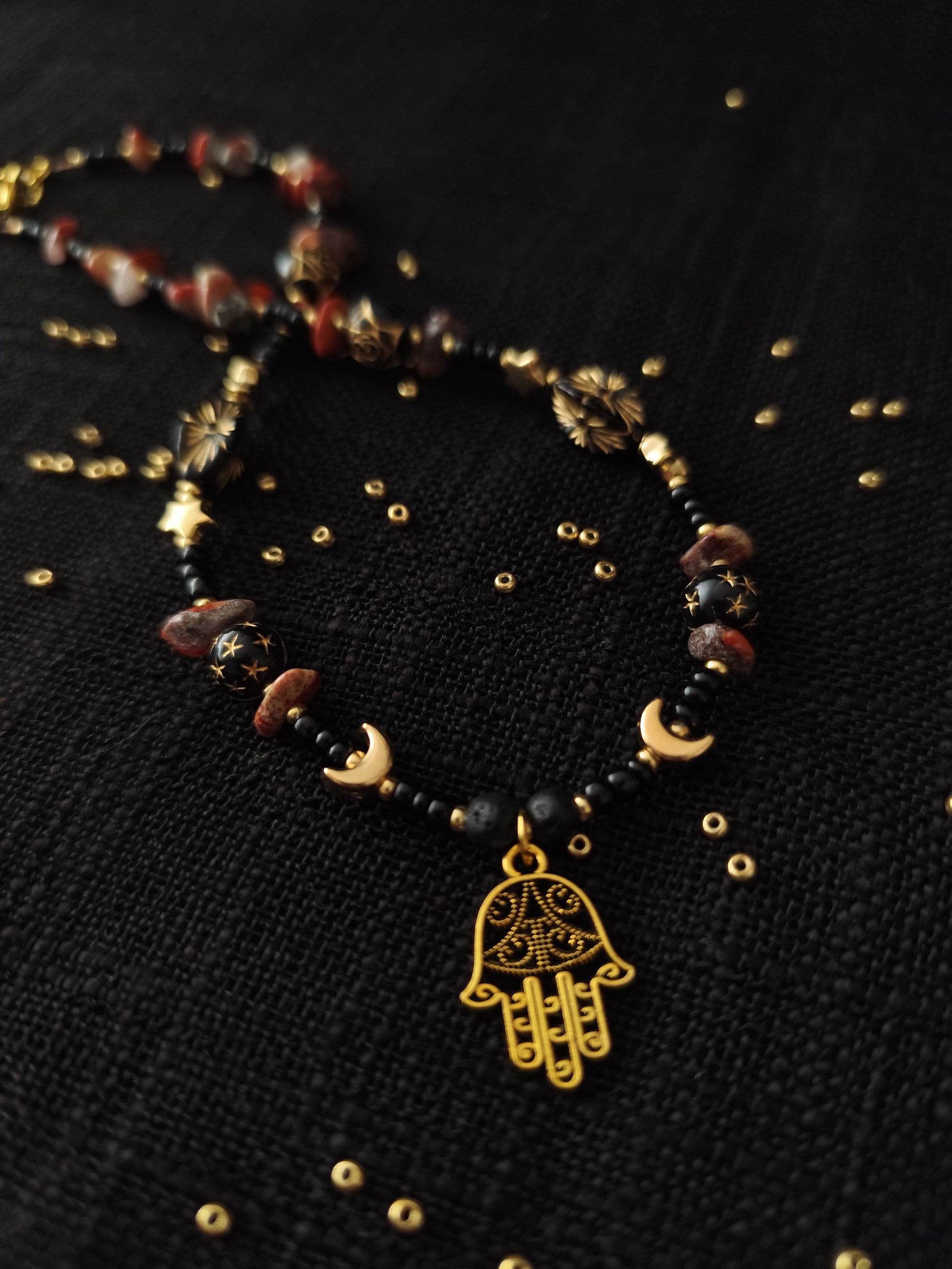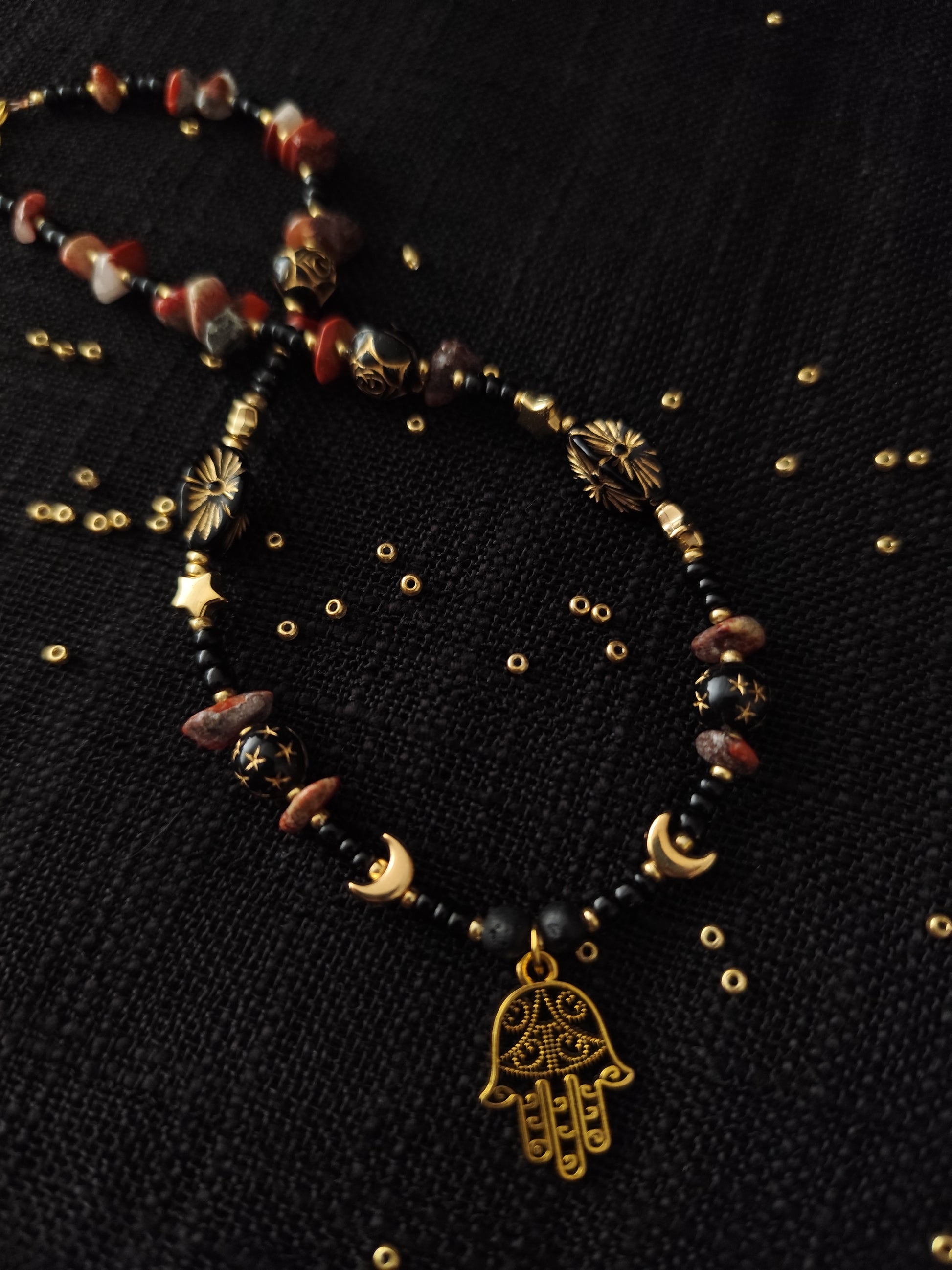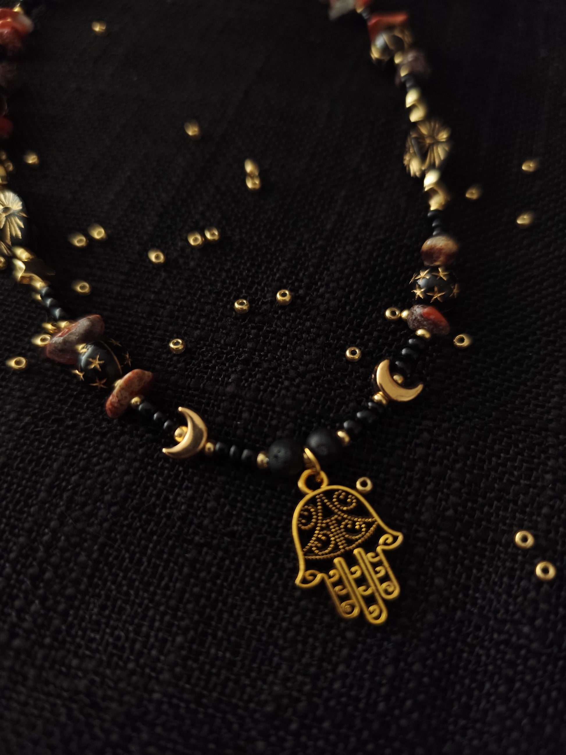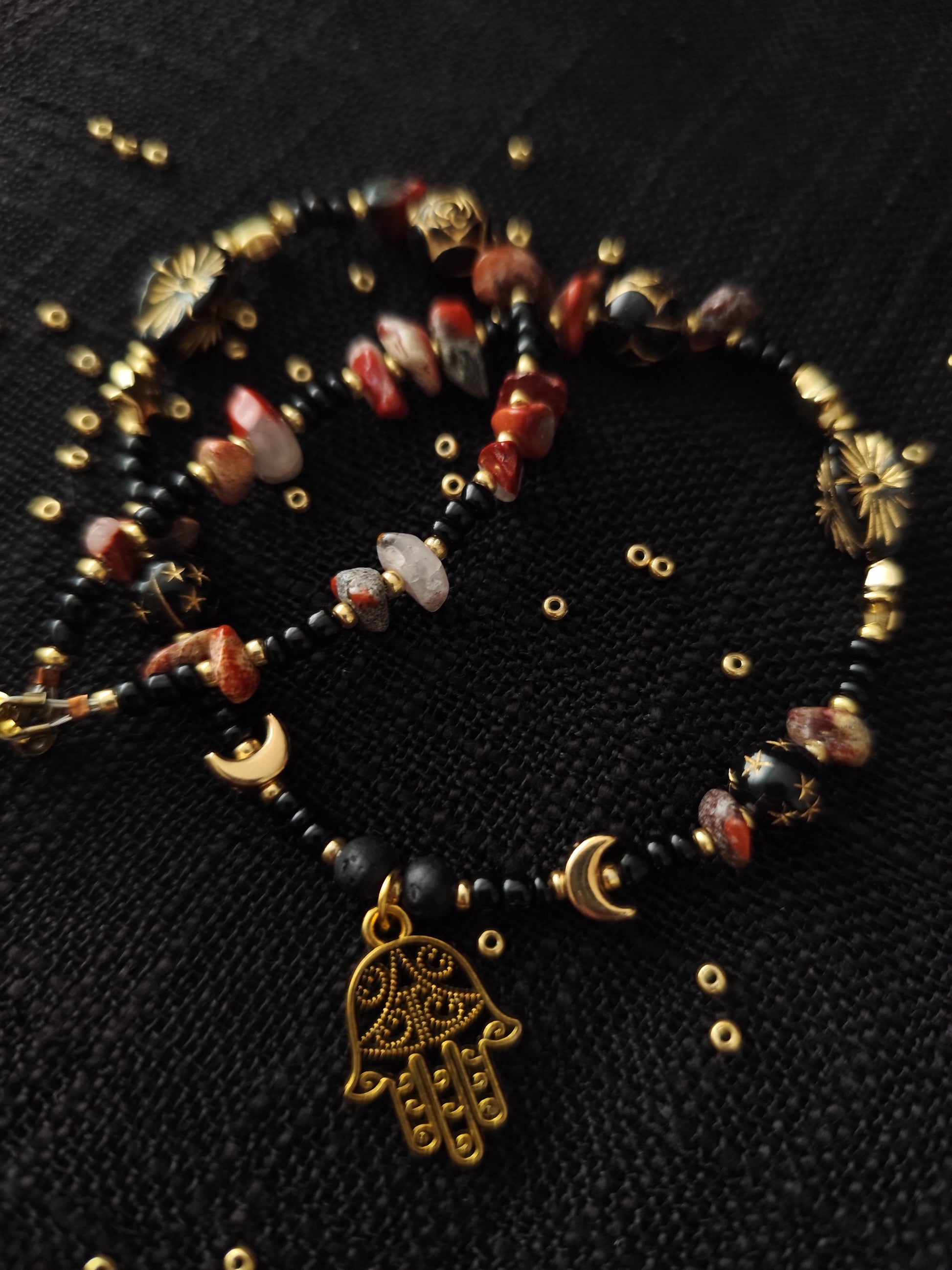Auksinis delnas primena apie jų budėjimą, o žemiški akmenys saugo ryšį su šaknimis. Nešiok jį kaip ženklą, kad niekada neini viena – senosios rankos laiko tave ir nukreipia į ten, kur tavo kelias šviesiausias.