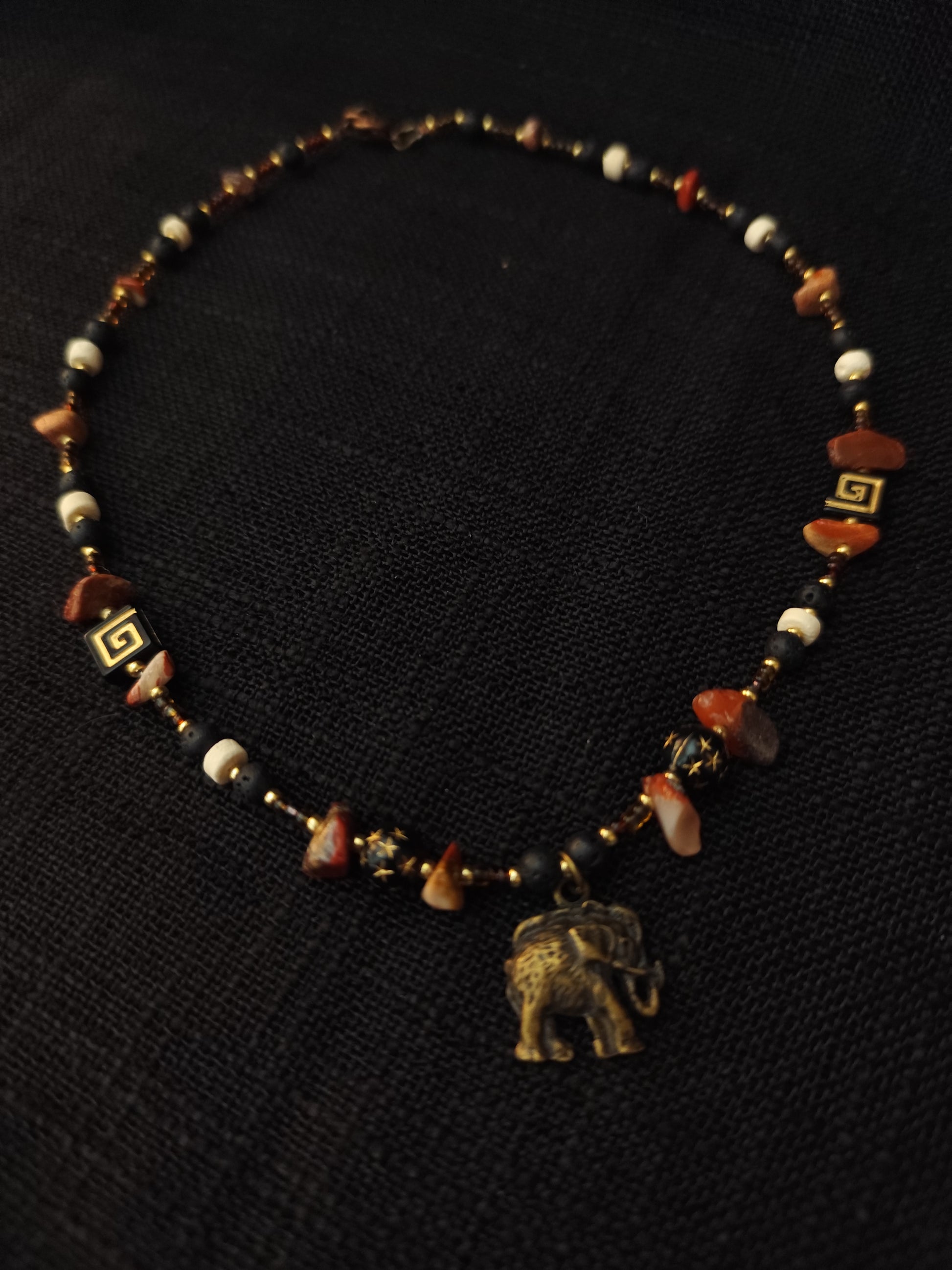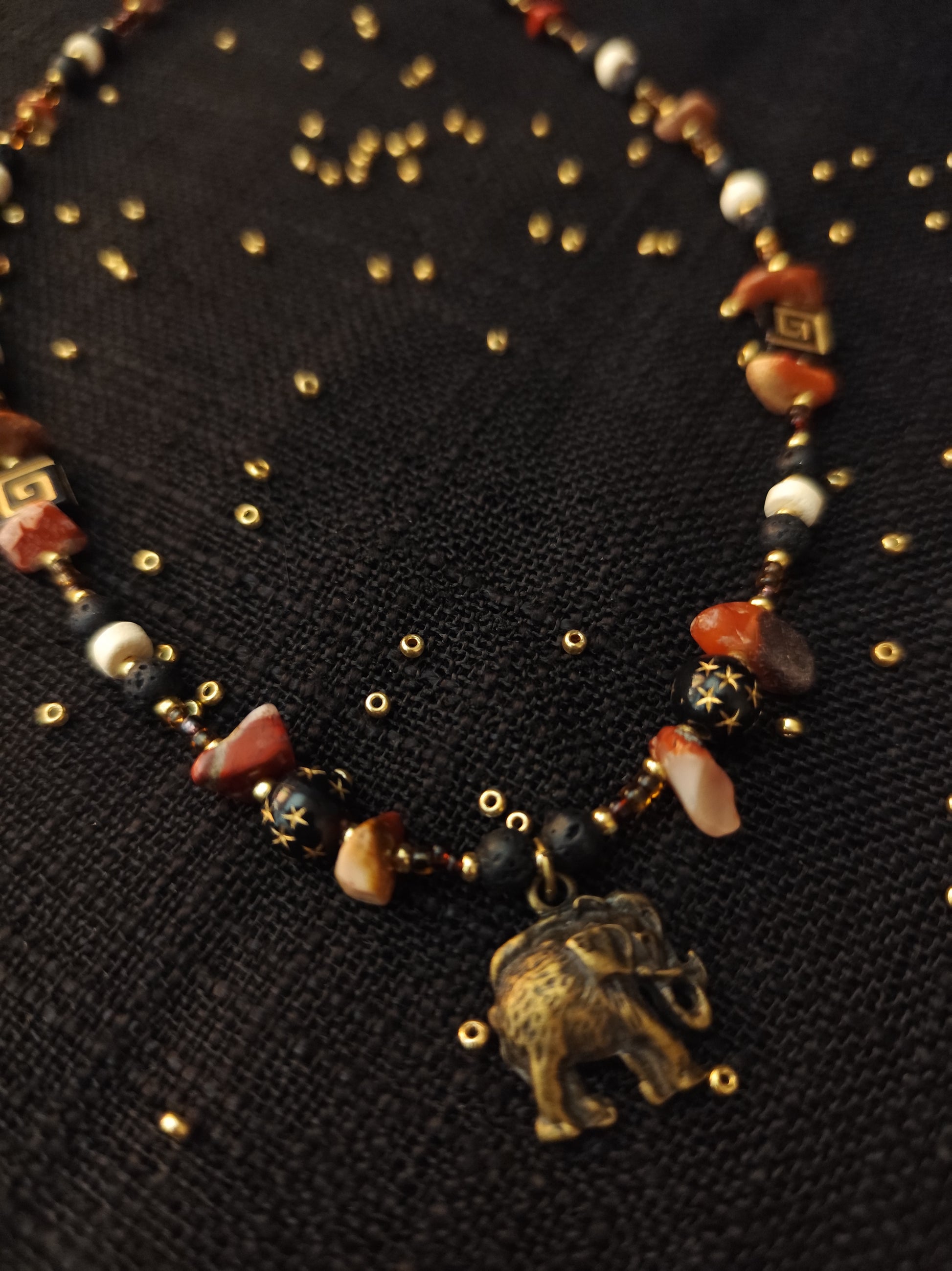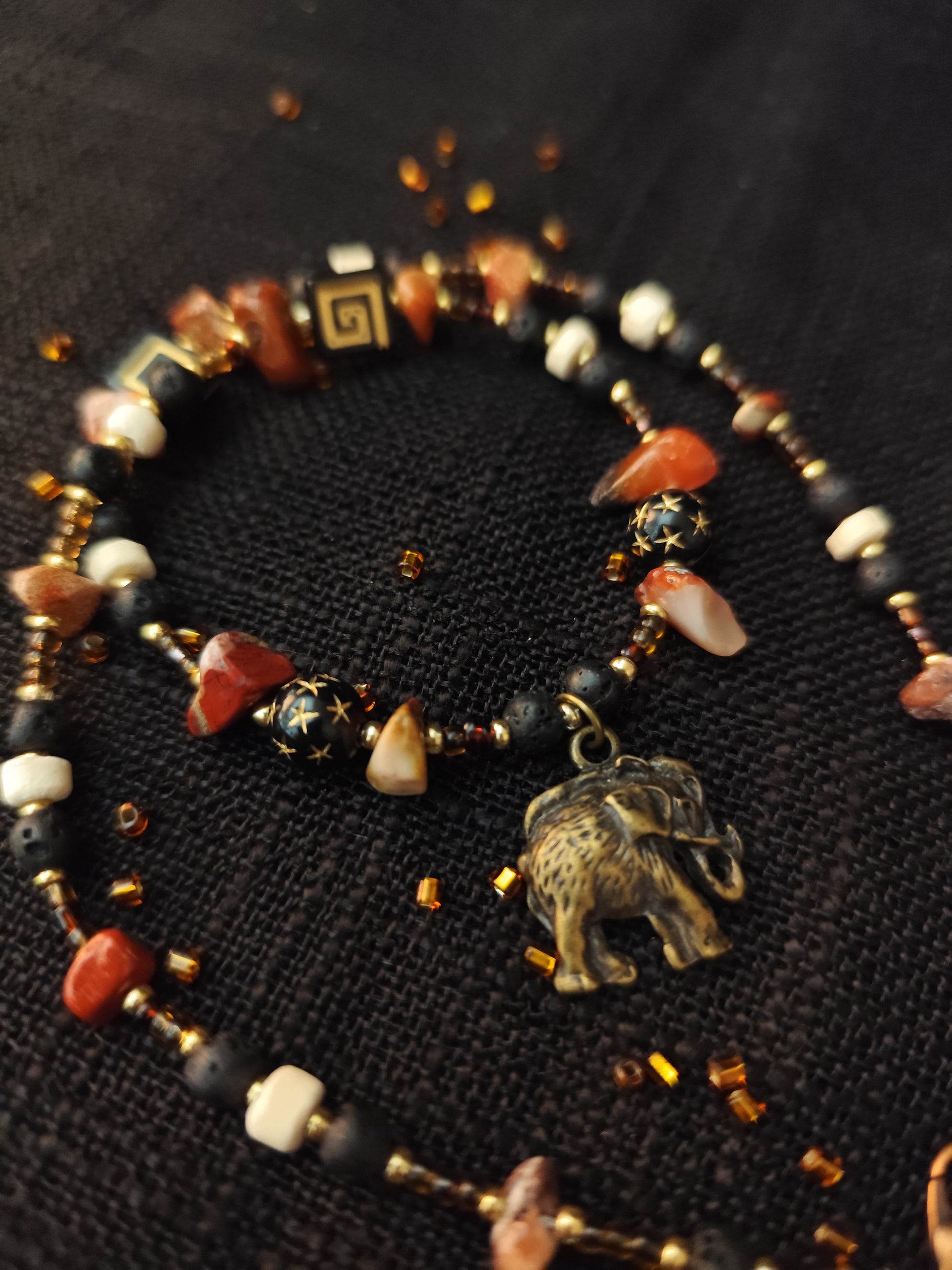 Tamsūs, rusvi ir kauliniai karoliukai darniai susilieja į žemišką, archajišką paletę, primenančią ugnies, akmens ir šalčio alchemiją. Tai vėrinys, kuris grąžina žmogų į šaknis — į kūno išmintį, į tylų vidinį tvirtumą, į žemės pulsą po kojomis.