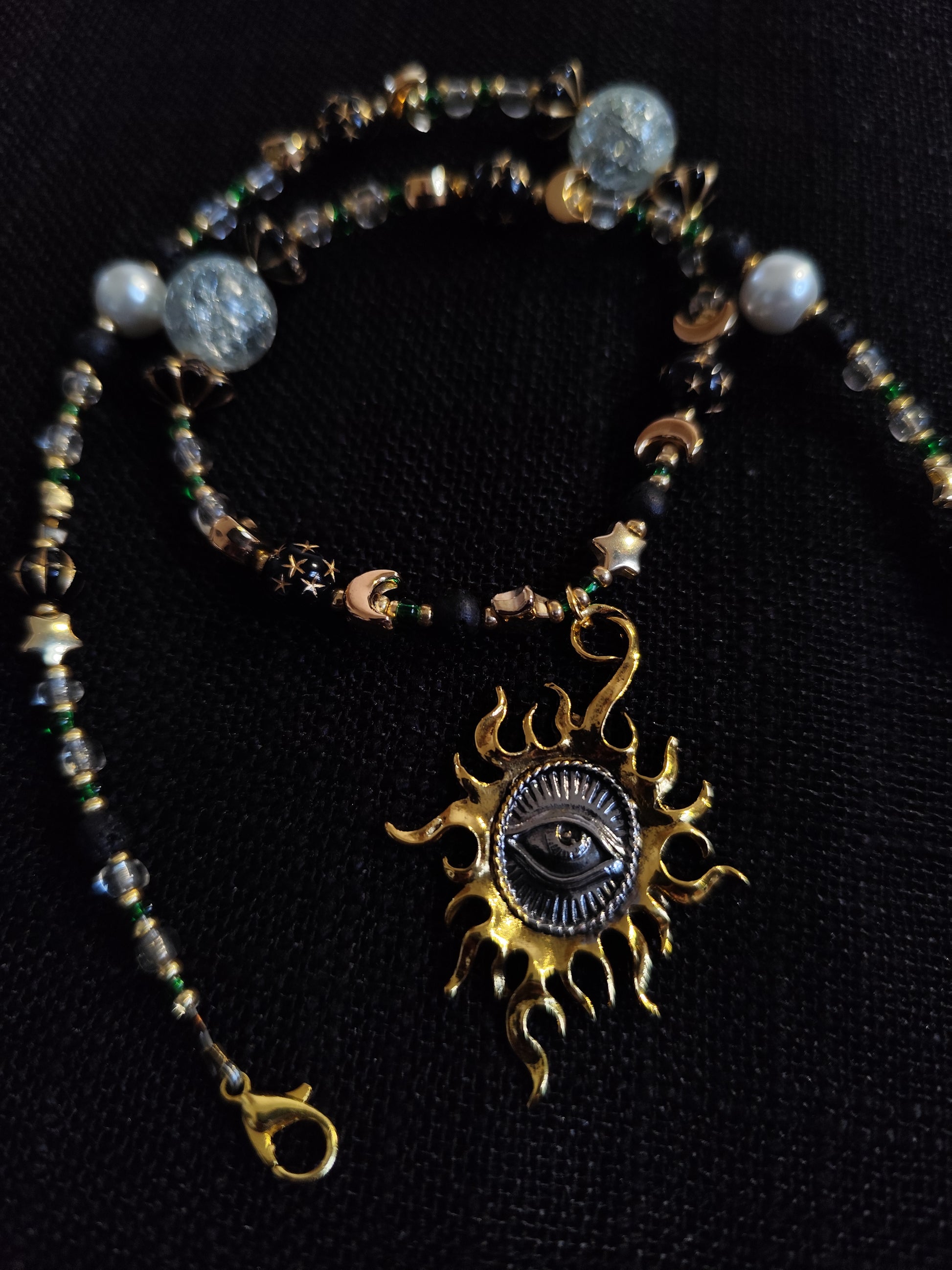 Vienetinis rankų darbo vėrinys ,,Reginti liepsna“ - tai amuletas, nešantis budrumo ir vidinės šviesos ženklą. Auksinė liepsna su akimi centre – tarsi protėvių žvilgsnis, lydintis per tamsą ir saugantis nuo klaidžių kelių. Smulkios žvaigždžių, mėnulio ir žemės atspalvių detalės kuria mistišką ir taikų nakties dangų – tą erdvę, kurioje prabunda intuityvumas.