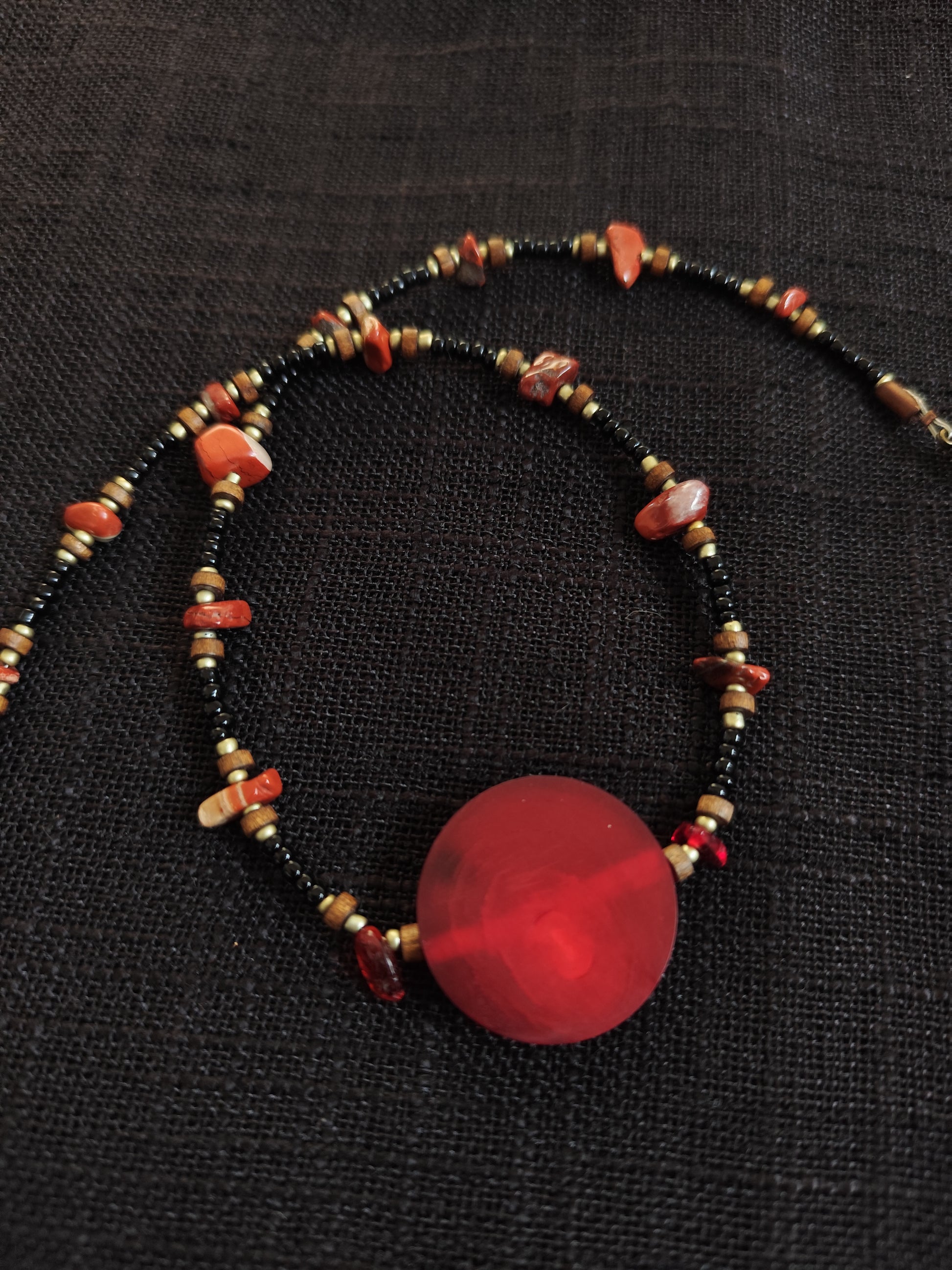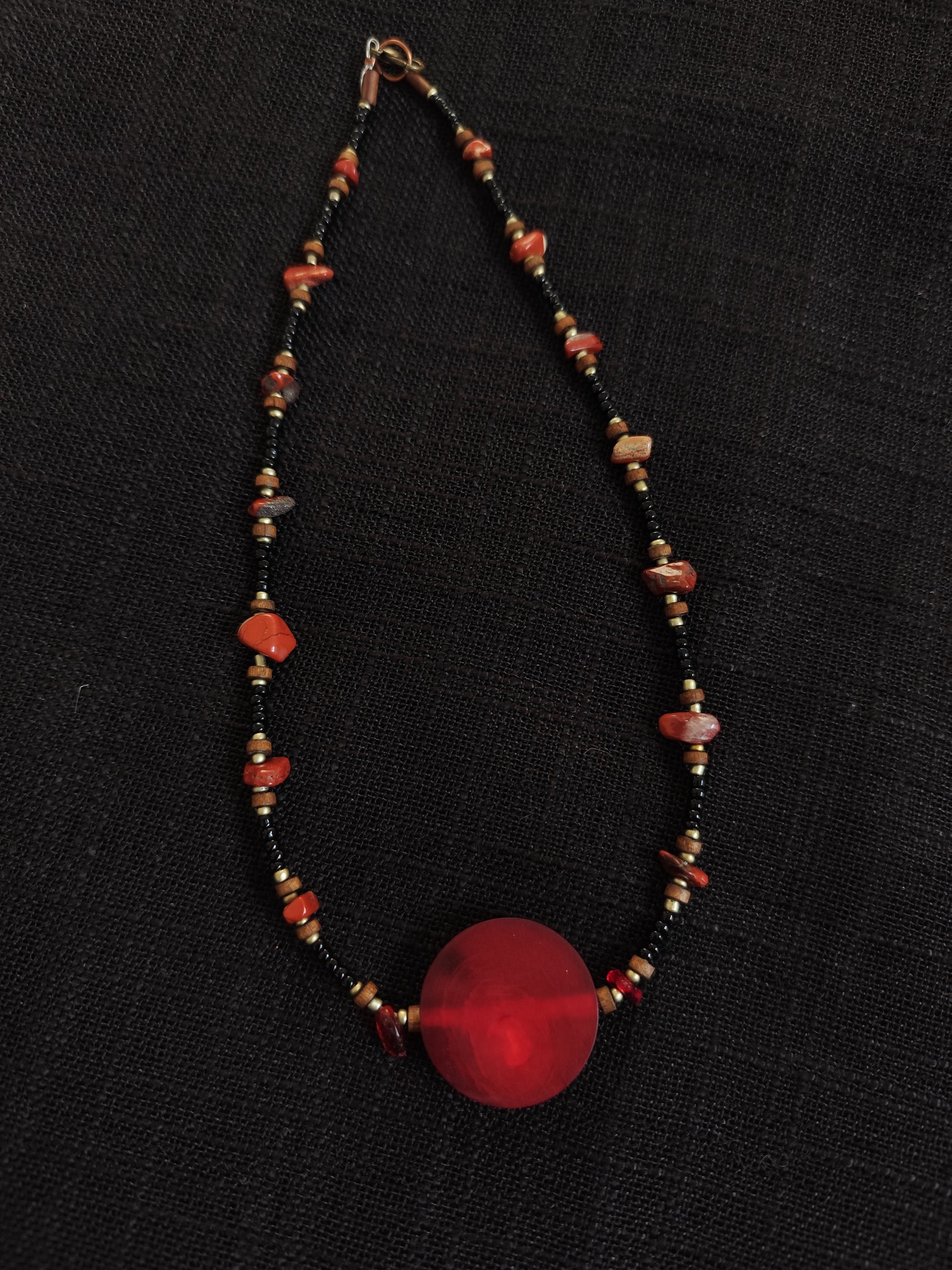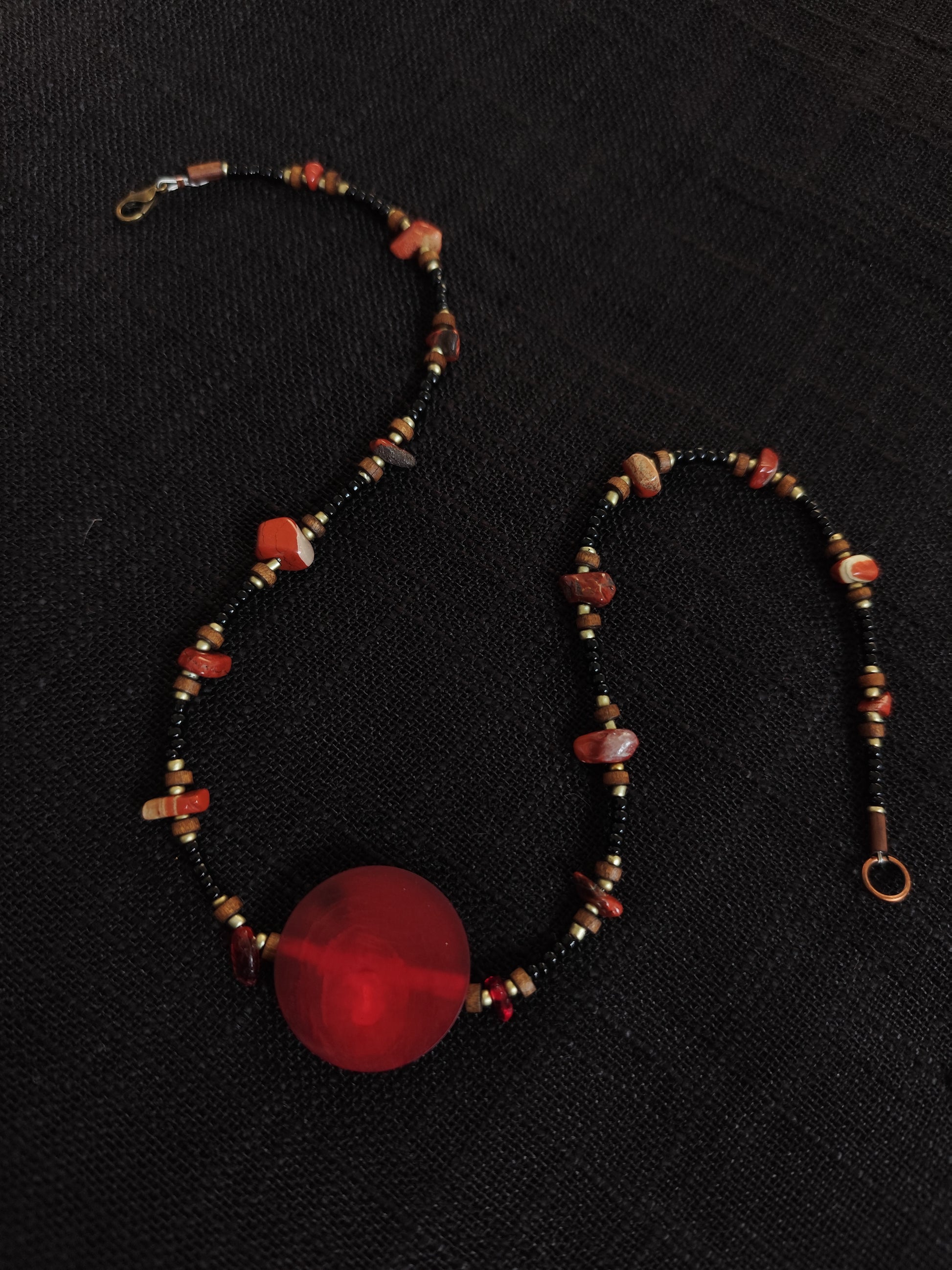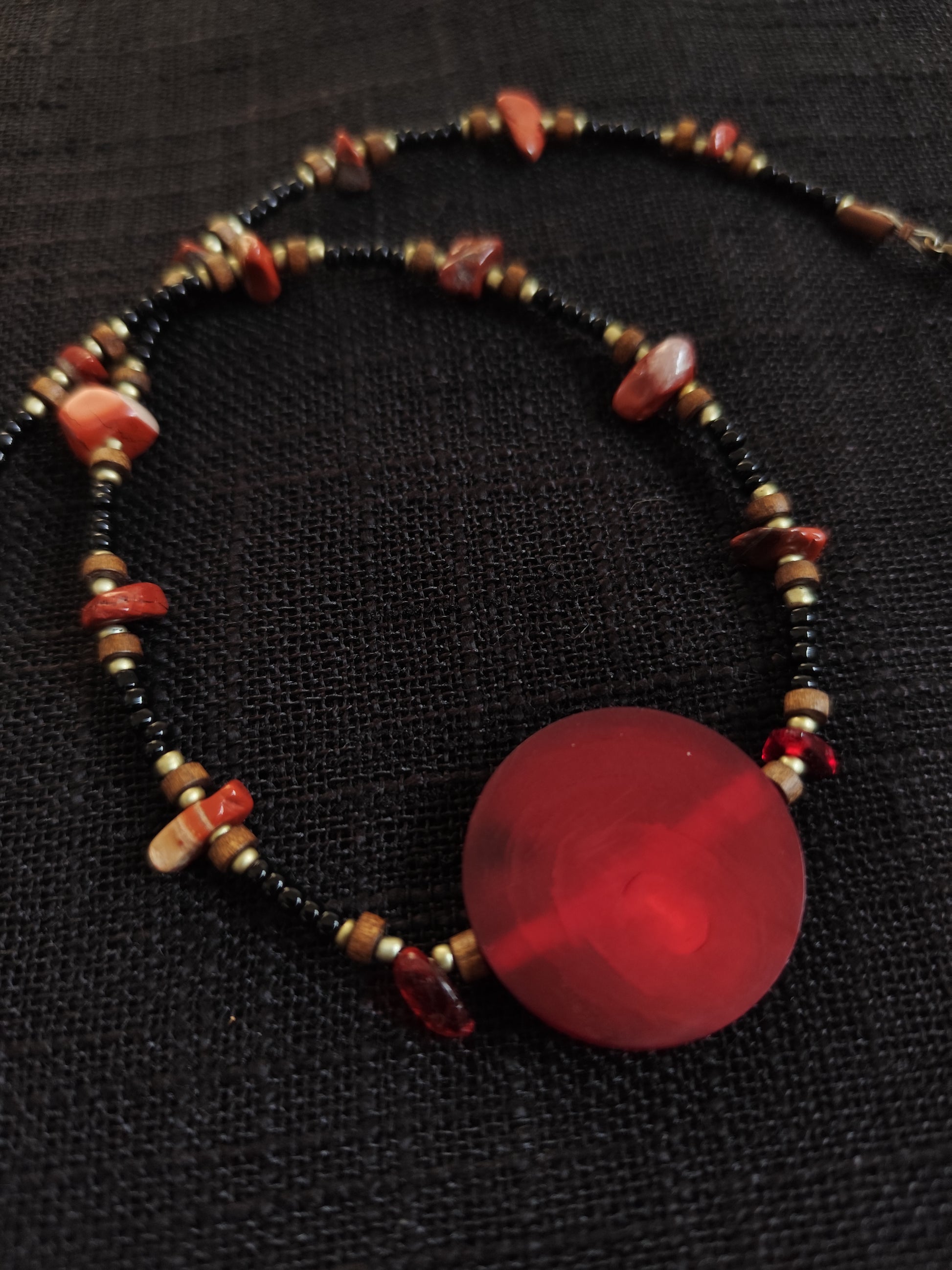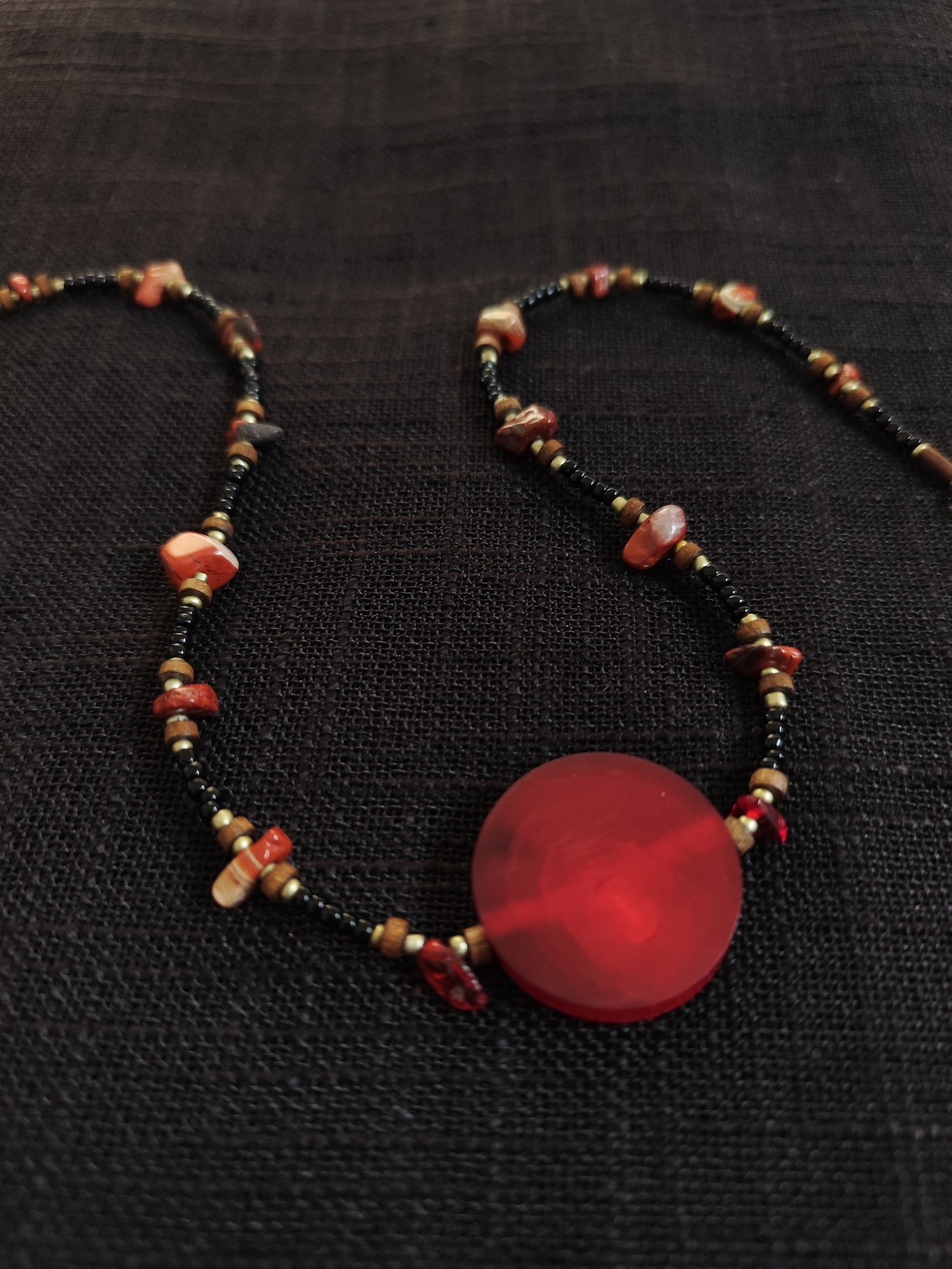 Raudonasis diskas šiame vėrinyje kalba ne tik apie saulės šerdį, bet ir tai, kas glūdi giliai, žmogaus vidinėje saulėje — protėvių paveldas, jų sukaupta jėga, šiluma, vidinė ugnis, žinios, išmintis, tiesa. Kiekvienas tamsesnis vėrinio karoliukas - lyg mažas atminties grūdas: apie tai, ką paveldime ne žodžiais, o krauju. Vėrinukas tegul primena, kad kai pamesti save, prisimink, kad metas sugrįžti į savo centrą ir laikyti šilumą ten, kur ji reikalingiausia – viduje. Ir tada - prisimink, kas esi.