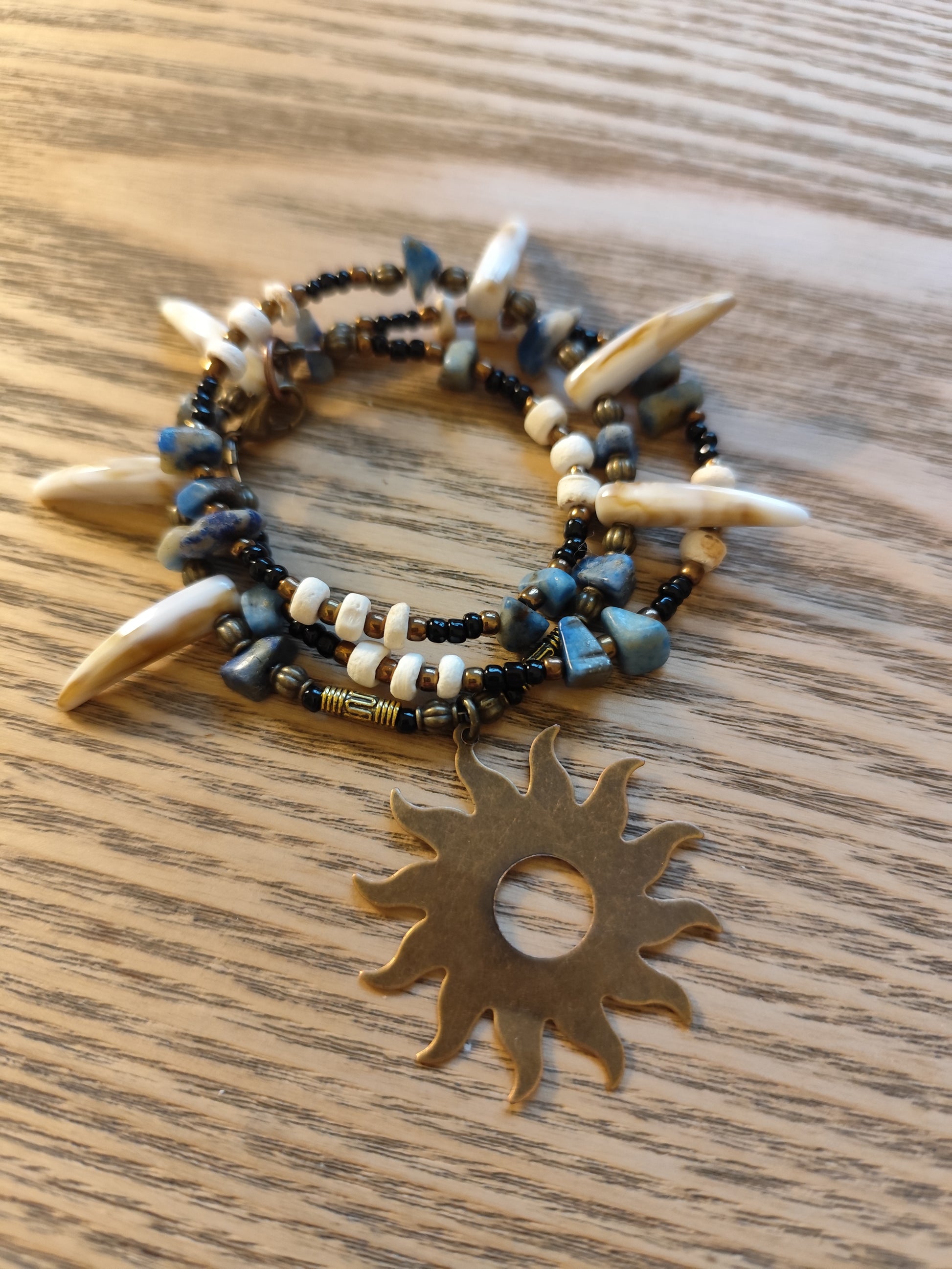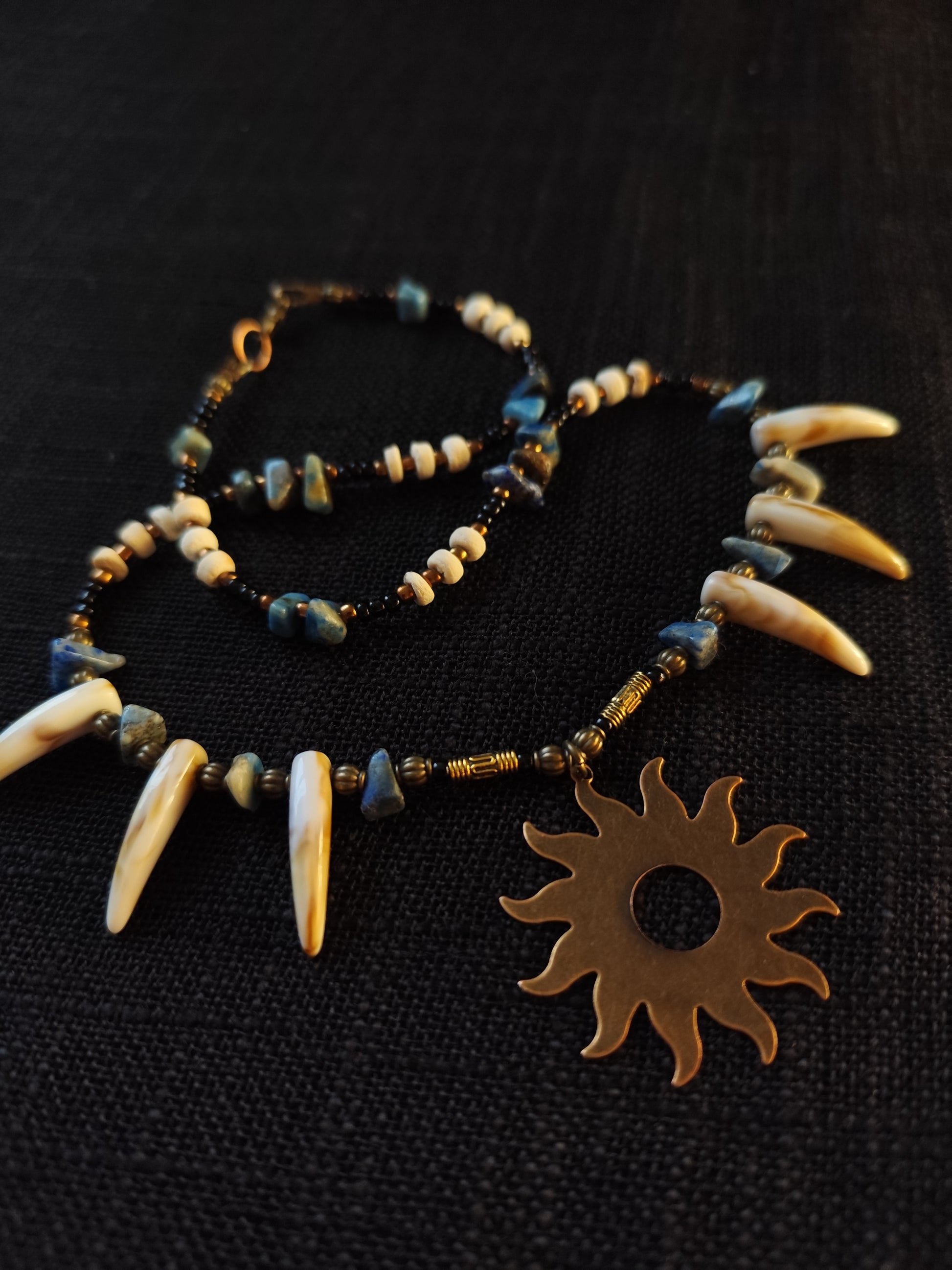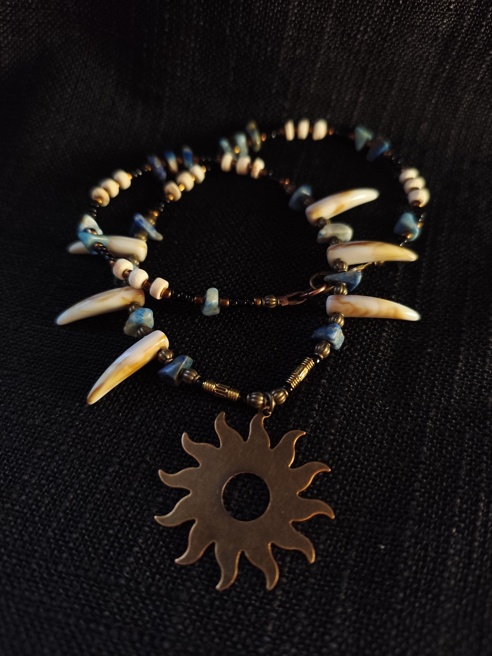 Tarp kaulo dantelių ir žalvario detalių įkomponuoti natūralūs lazurito akmenėliai suteikia papuošalui sakralios gelmės. Lazuritas – karališkas mėlynas akmuo, nuo senovės laikytas dvasinės išminties, intuicijos ir tiesos saugotoju. Jo mėlyna spalva subalansuoja vėrinio ugnį vandens ramybe, o balti bei auksiniai intarpai primena dangaus platybių šviesą.