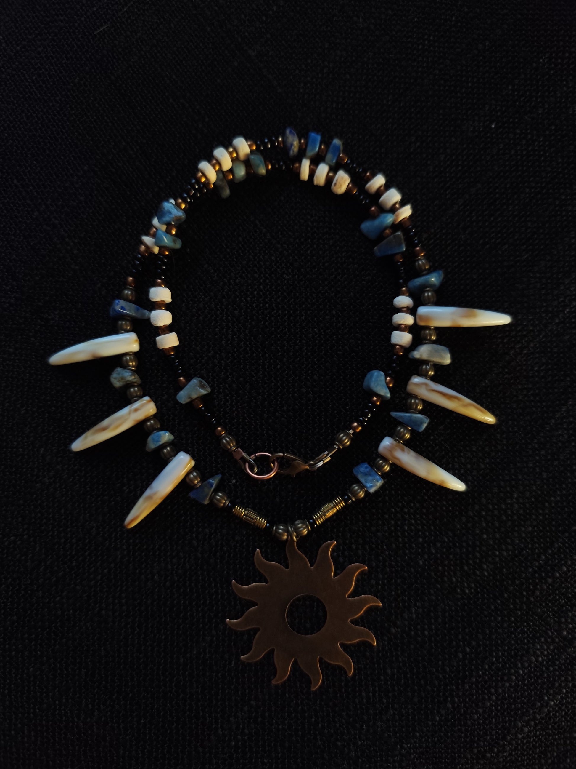 Kaulo elementai kuria pirmykštį, toteminį pojūtį – lyg senųjų medžiotojų, žynių ir miško dvasių energija būtų įpinta tiesiai į vėrinį. Lazuritas pakylėja, varis saugo, o ugnies forma įkvepia transformacijai.