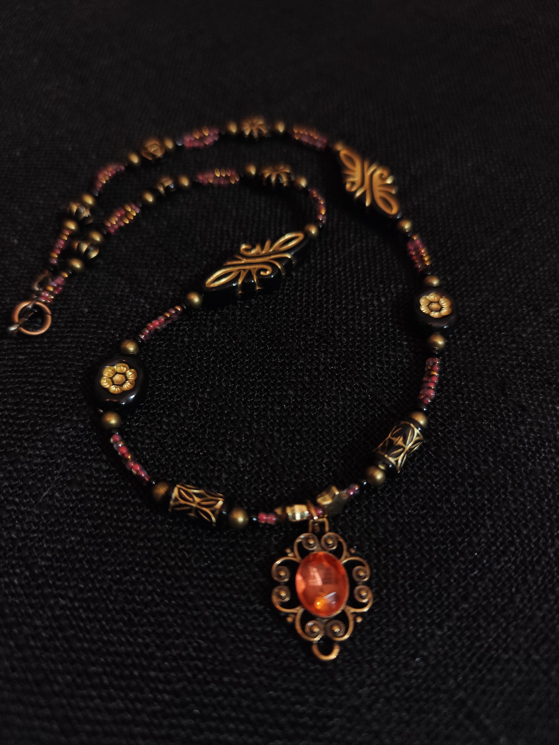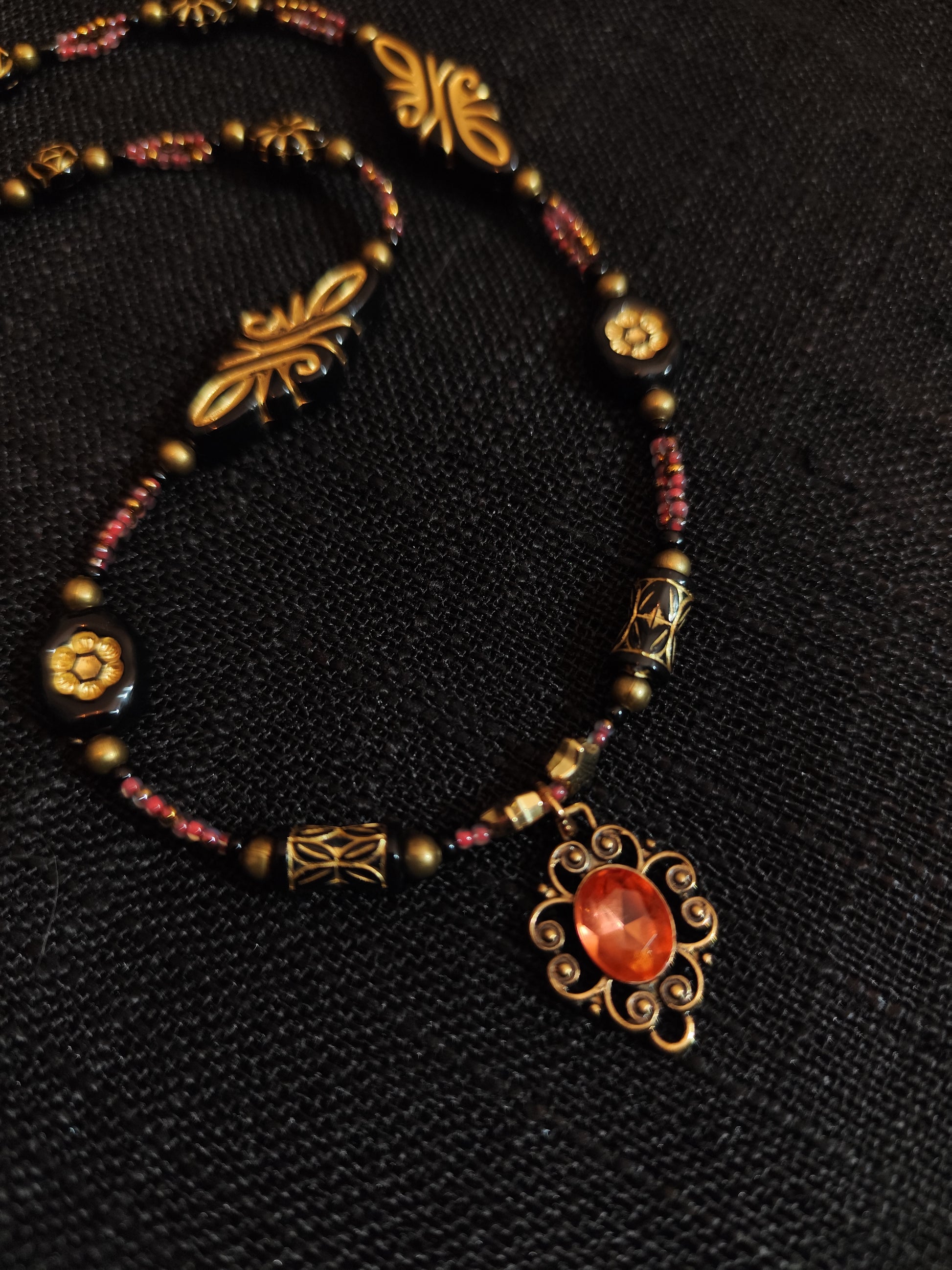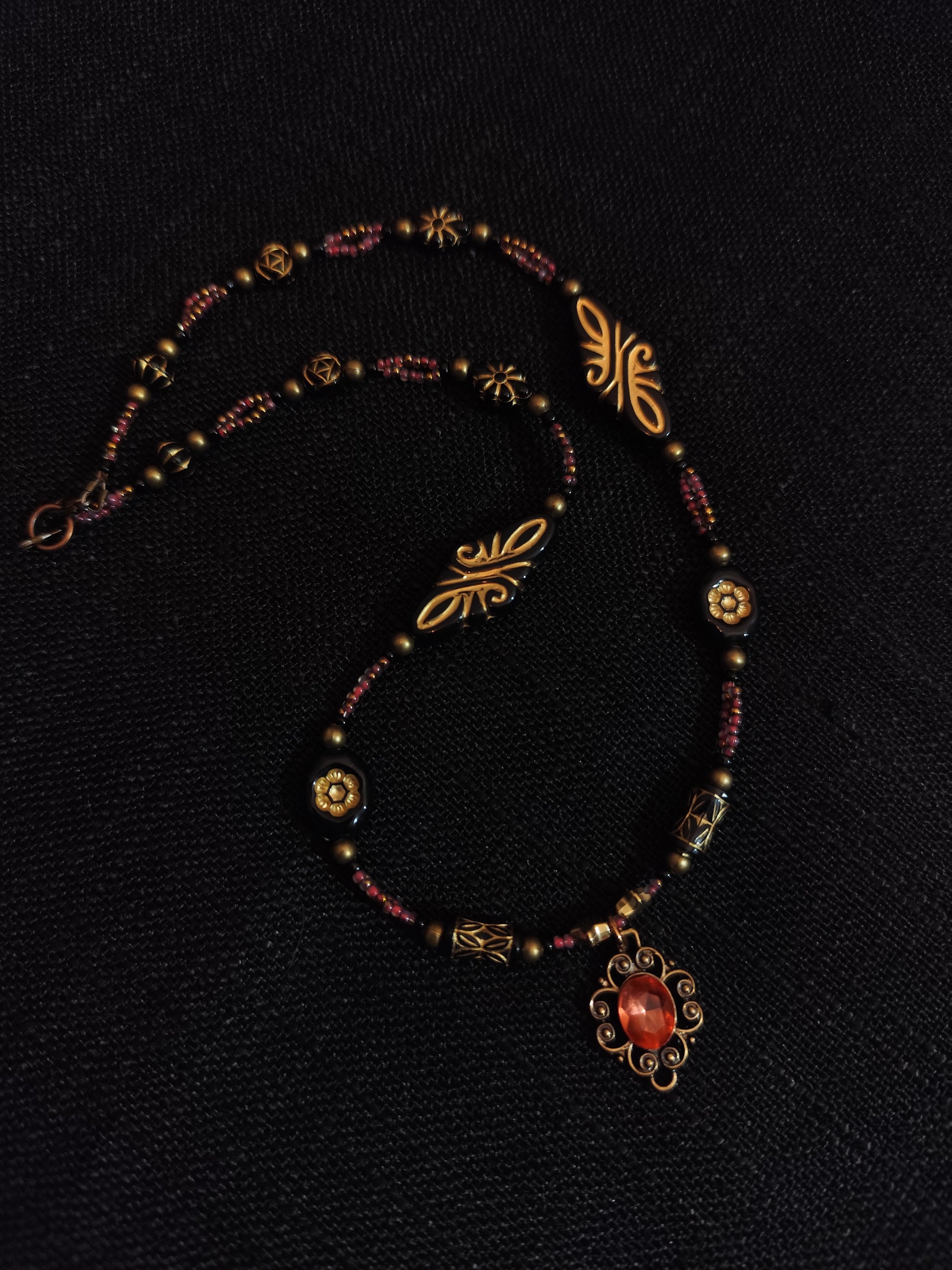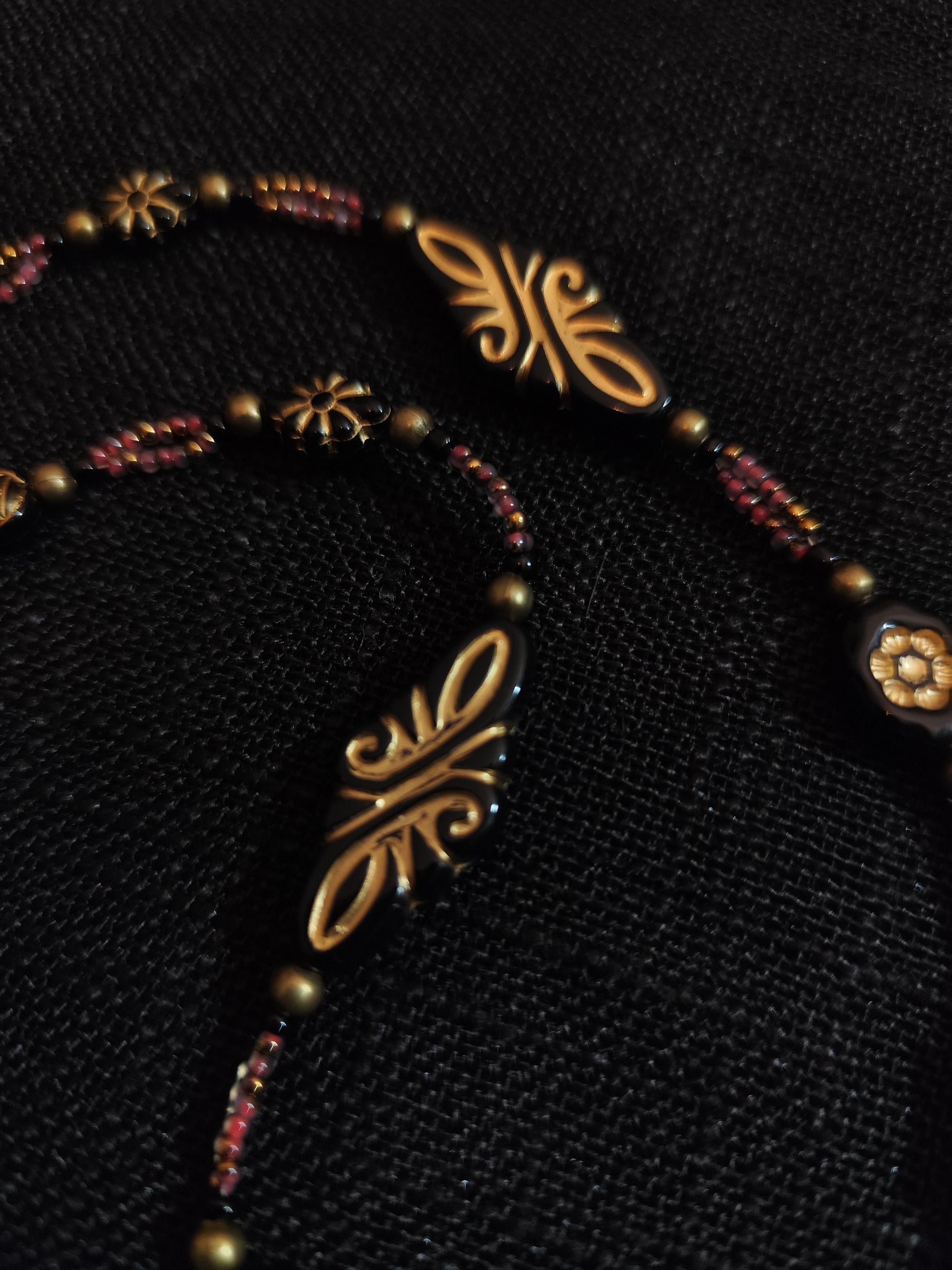 Rankų darbo vienetinis vėrinys ,,Veneros dvasia". Juodai–auksinės detalės kuria prabangią moteriškos paslapties aurą, o rožinis akmuo centre — tarsi gyva meilės sėkla, nešanti jautrumą, grakštumą ir tylų, bet nepalaužiamą moters stiprumą. Tai amuletas, primenantis, kad švelnumas, tyrumas, tikrumas, gerumas ir širdies šviesa yra tikroji moters galia.